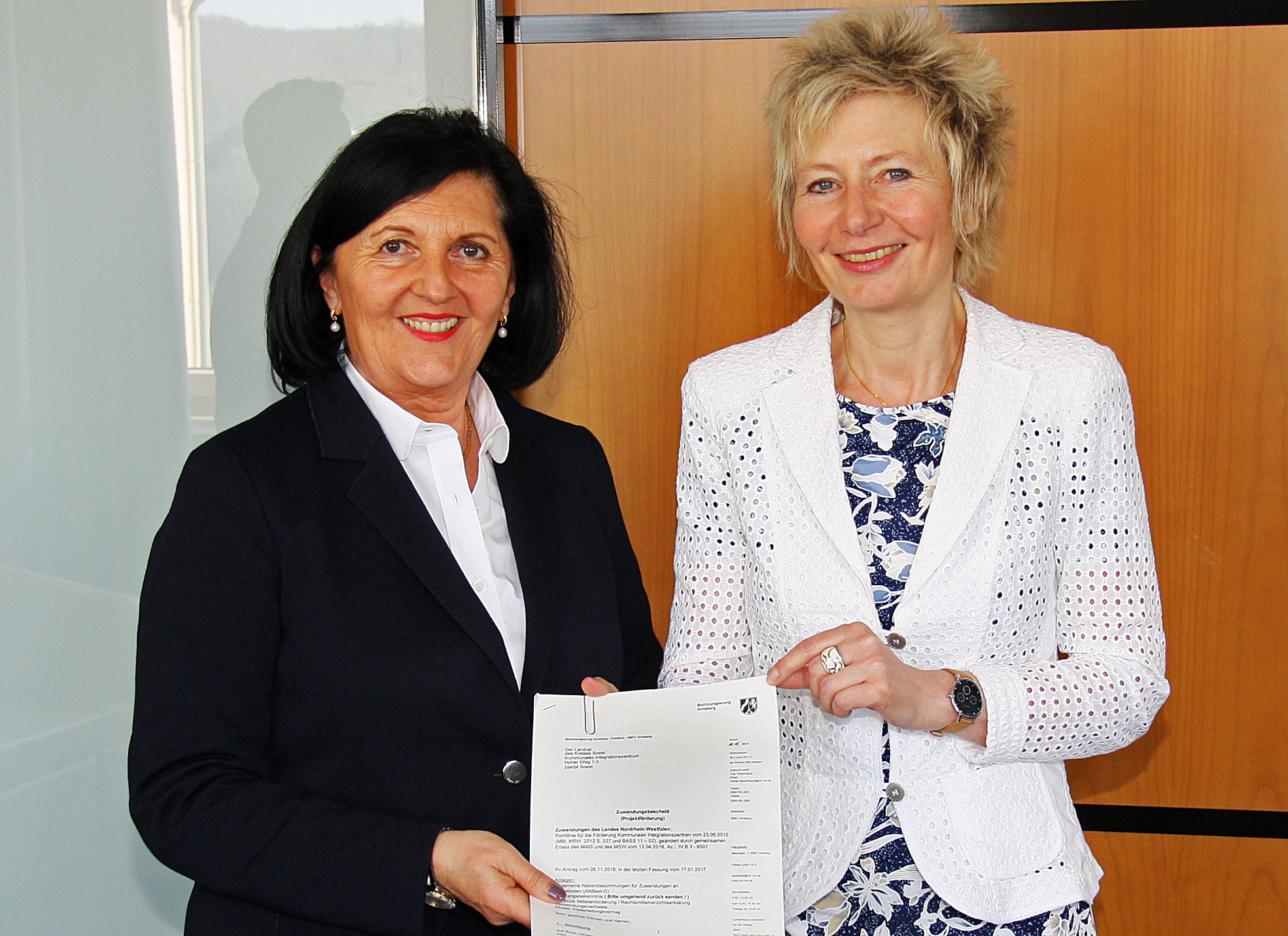 Landrätin Eva Irrgang hat von Regierungspräsidentin Diana Ewert in Arnsberg einen Förderbescheid in Höhe von 131.066 Euro aus dem Förderprogramm „KOMM-AN NRW“ entgegengenommen. Foto: Paul Knierbein/ Kreis Soest